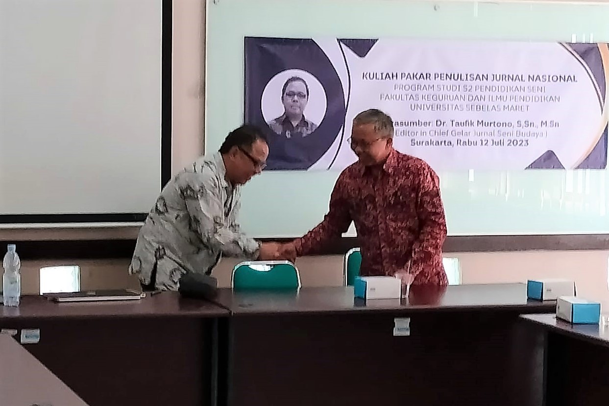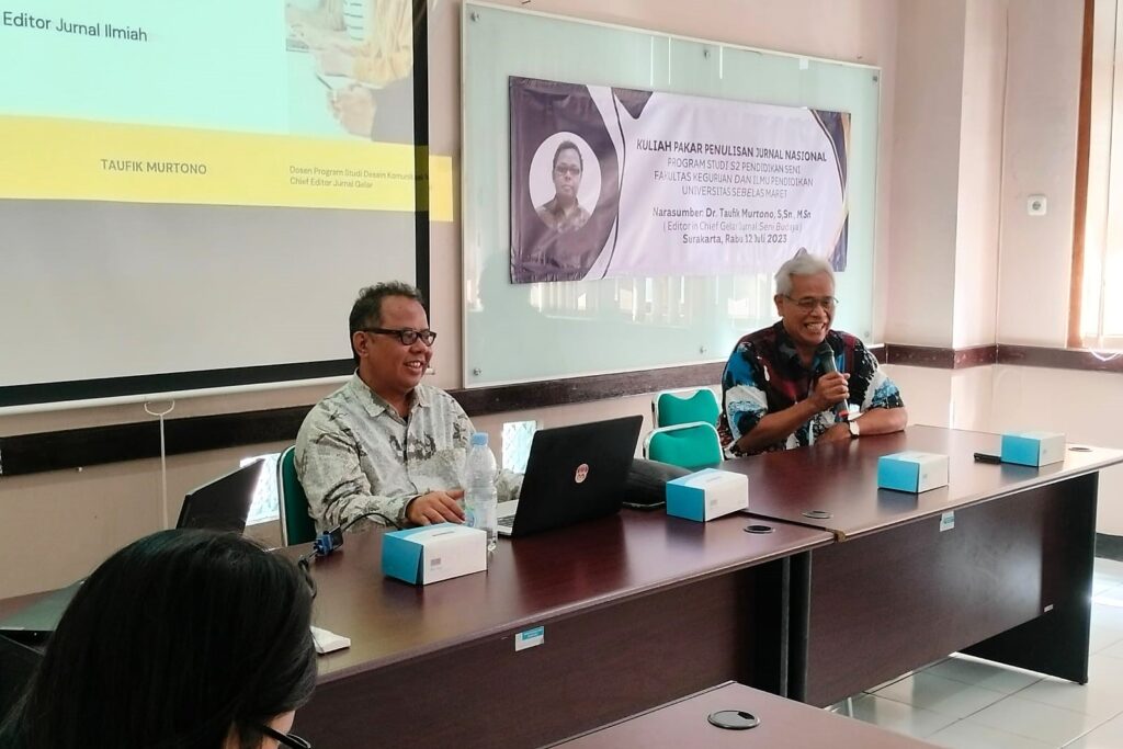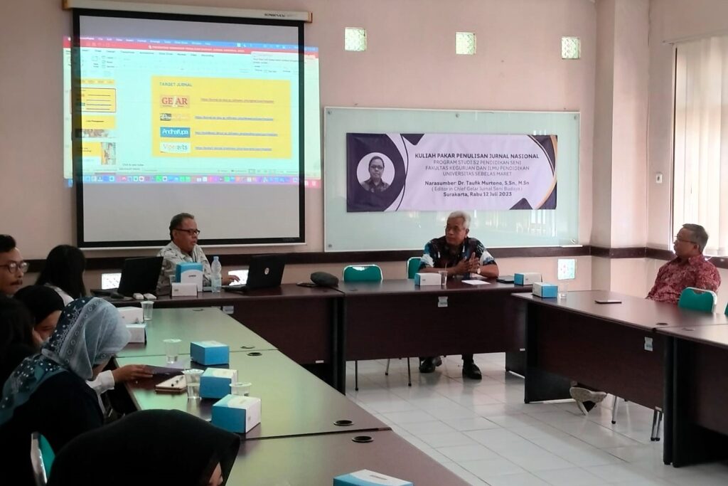 Untuk mencapai sejumlah tujuan penulisan jurnal ilmiah tersebut, Program Studi Magister Pendidikan Seni FKIP UNS menyelenggarakan kuliah pakar, Rabu 12/7. Kuliah ini diisi oleh dosen tamu Dr. Taufik Murtono, M.Sn dari Prodi DKV ISI Surakarta. Kuliah pakar diikuti 30 peserta dari mahasiswa Program Studi Magister Pendidikan Seni FKIP UNS serta peserta dari Musyawarah Guru Mata Pelajaran (MGMP) Soloraya. Ketua Program Studi Magister Pendidikan Seni FKIP UNS Prof. Dr. Mulyanto, M.Pd dalam sambutannya menjelaskan bahwa kuliah pakar diselenggarakan di kampusnya setiap semester dengan target mendapatkan artikel ilmiah mahasiswa Pascasarjana yang berkualitas dan dapat terbit minimal di Jurnal Ilmiah Terindeks Sinta-2. Indeks Sinta-2 merupakan syarat bagi mahasiswa pascasarjana pada umumnya.