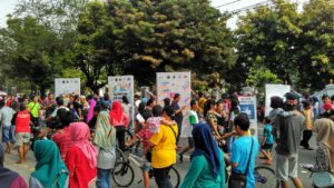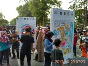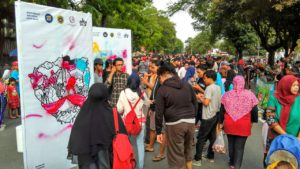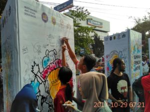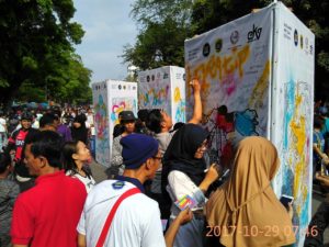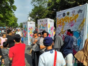 Selain itu masyarakat pengunjung CFD bisa berinteraksi dengan ikut menggambar dengan cat semprot melalui media stencil atau menulis pesan sebagai simbolis dalam turut mendukung aksi Sumpah Pemuda Anti Hoax tersebut.