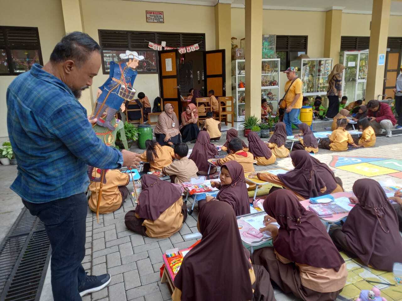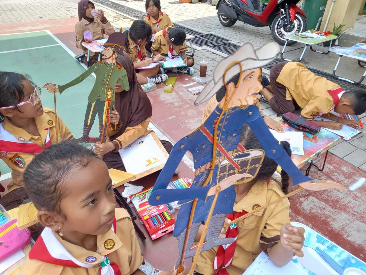 Tampak ratusan siswa sekolah dasar sangat antusias mewarnai karakter wayang sambil sesekali melihat contoh wayang Legiun Kavaleri Mangkunegaran yang dibawa oleh mahasiswa yang sekaligus sebagai pendamping kegiatan ini.