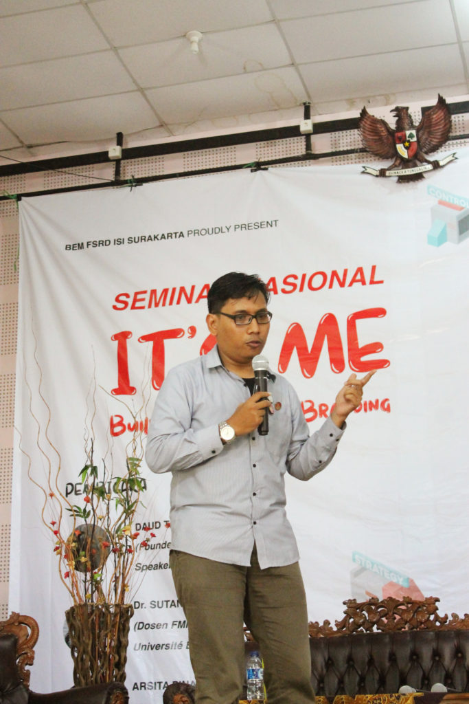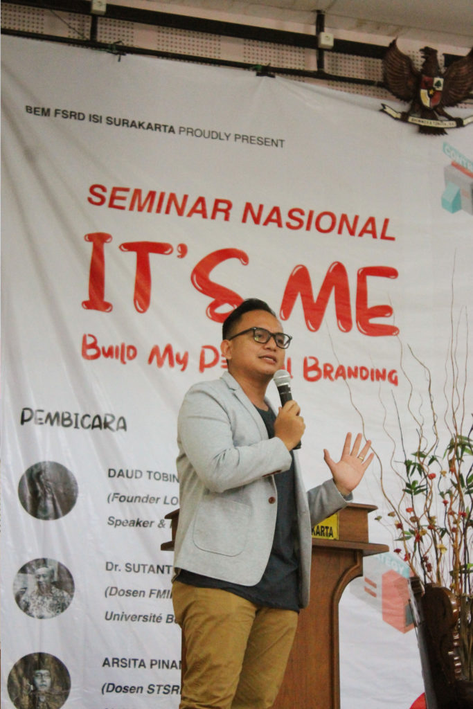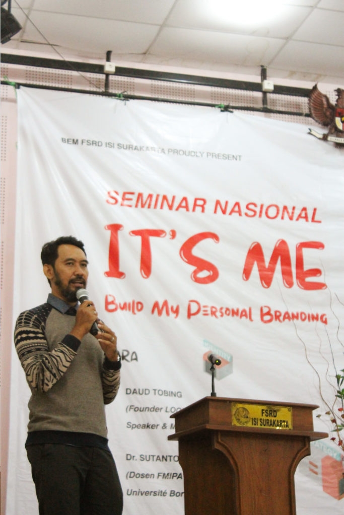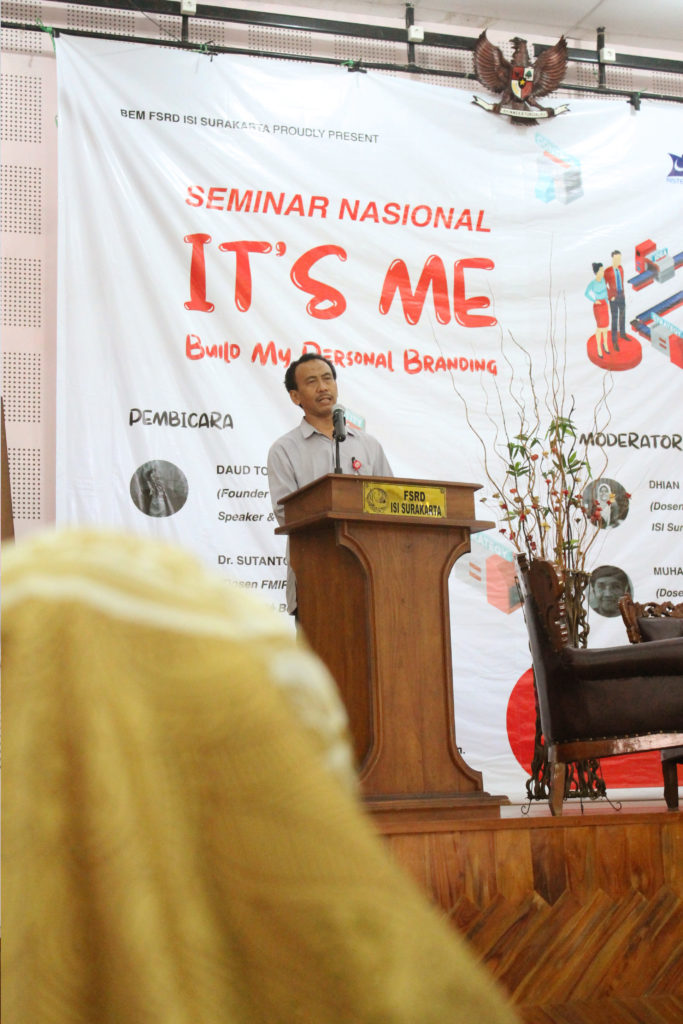 Seminar Nasional Mahasiswa dengan tema menarik tersebut dilaksanakan pada Kamis, 28 Maret 2019 di Gedung Sungging Prabangkara Kampus II FSRD ISI Surakarta. Seminar Nasional menghadirkan 4 pembicara yaitu Daud Tobing (Founder at LOGIOS-system & Broadcast Media dan Moderator and Speaker BEKRAF), Dr. Sutanto, S.Si.DEA (Dosen Universite’ Bordeaux Prancis dan Dosen Prodi Matematika UNS), Arsita Pinandita, M.Sn. (Dosen STSRD VISI Yogyakarta dan Aktivis Kesenian Yogyakarta ), dan Asmoro Nurhadi Panindias, M.Sn. (Dosen Prodi DKV ISI Surakarta). Pemateri mengajak peserta untuk mengenal dan peduli terhadap potensi diri sendiri. Melalui potensi diri, akan dikembangkan menjadi branding yang bisa dikenal oleh khalayak.