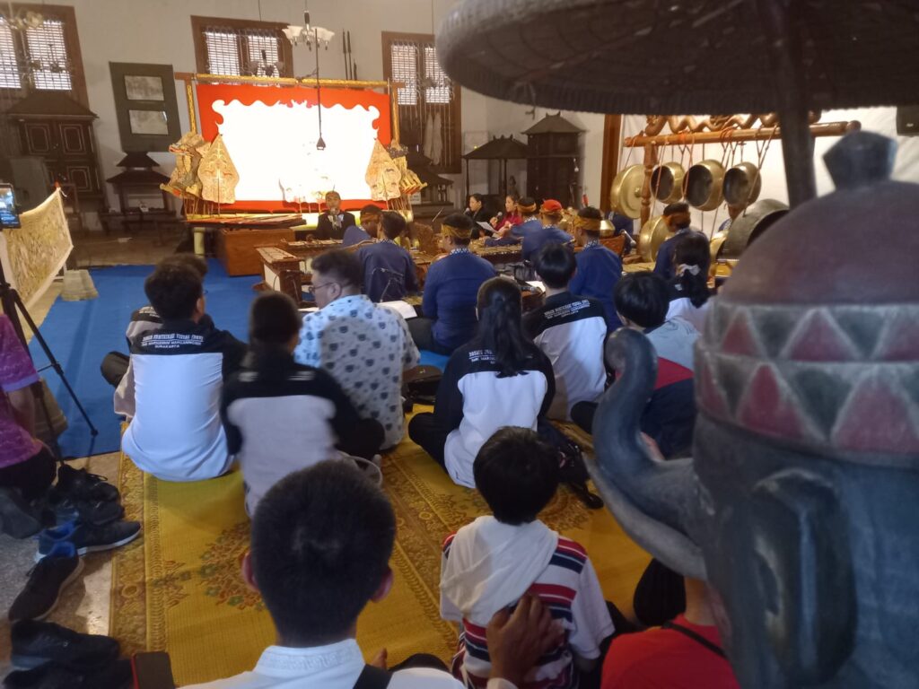 Tampak siswa SMK Marsudirini Marganingsih Surakarta sangat antusias menonton pementasan Wayang Climen dengan mengamati setiap adegan lewat tayangan animasi yang dikolaborasikan dengan pementasan wayang kulit yang bertempat Museum Radya Pustaka Surakarta.