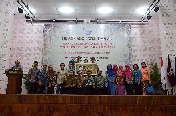FSRD telah menyelenggarakan lepas calon wisudawan periode I tahun akademik 2015/2016 di Balai Ekspresi Raden Sungging Prabangkara pada Minggu, 14 Pebruari 2016 pukul 19.00 WIB s/d 22.00 WIB. Selain jajaran pimpinan, staff, Pembimbing Akademik calon wisudawan, orang tua wisudawan, dan dosen acara lepas wisuda di Fakultas Seni Rupa dan Desain ini juga dihadiri oleh rektor ISI Surakarta Prof. Dr. Sri Rochana W, S.Kar., M.Hum. Dekan Fakultas Seni Pertunjukan Soemaryatmi, S. Kar., M.Hum, dan Ka. Biro AAKPKS yaitu Drs. Maryanto, MM juga turut diundang dalam pelepasan calon wisudawan dalam rangka untuk mempererat tali kekeluargaan. Dalam pidatonya, rektor ISI Surakarta menyampaikan pesan kepada calon wisudawan untuk selalu menjadi anak yang berbakti kepada kedua orang tuanya. Menurut beliau, bagaimanapun juga kesuksesan anak sangat ditentukan oleh keridho-an dan do’a orang tuanya.