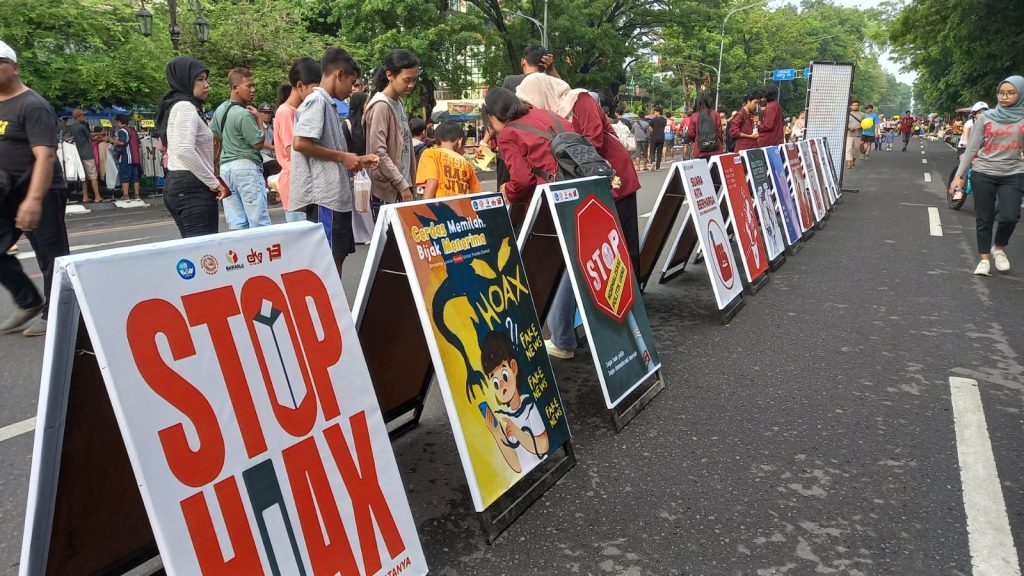 Puluhan poster kreatif hasil karya mahasiswa Fakultas Seni Rupa dan Desain (FSRD) ISI Surakarta menghiasi area Car Free Day (CFD) di Jalan Slamet Riyadi, Solo, pada Minggu pagi, (3/11/2024). Karya seni visual ini menarik perhatian banyak pengunjung, termasuk satu keluarga yang tampak asyik menikmati setiap desain poster sebelum ikut menempelkan stiker dukungan di papan yang telah disediakan.
