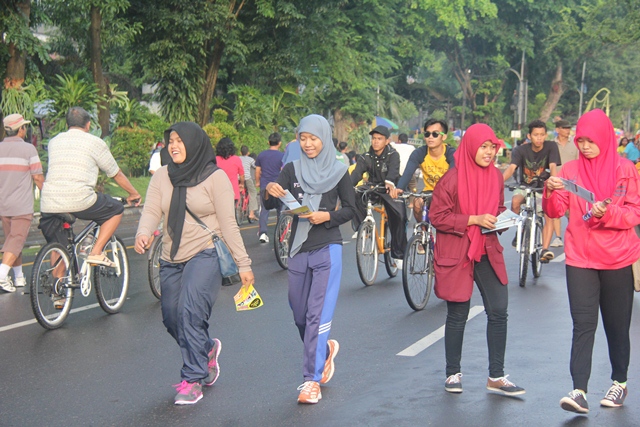 Mahasiswa membagi-bagikan brosur kepada pengunjung Car Free Day (Foto: Bias-2015)