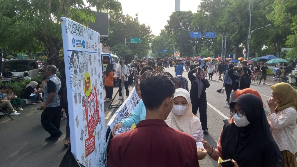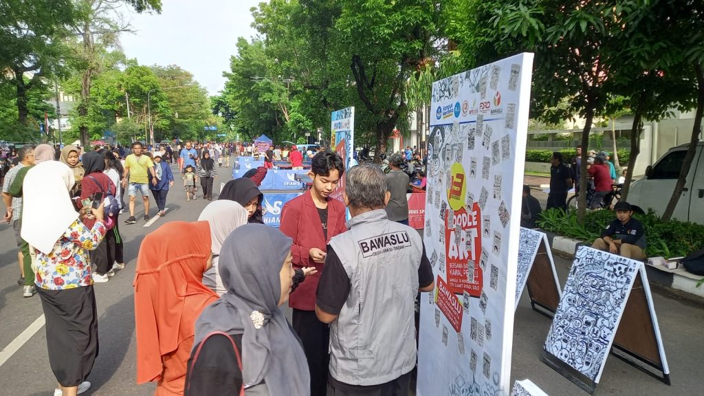 Beberapa pengunjung terlihat antusias melihat karya doodle art yang dipajang di area CFD Slamet Riyadi Solo, dimana aksi kreatif yang mengangkat tema Bersama Bawaslu Kawal Pemilu sebagai bentuk dukungan dari mahasiswa semester I Prodi DKV FSRD ISI Surakarta dari goresan dari tugas mata kuliah Menggambar Dasar.
