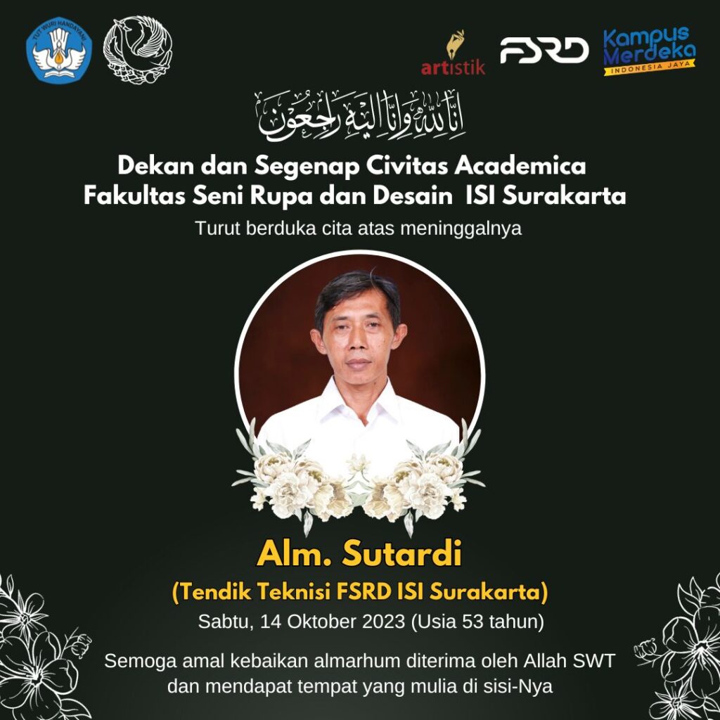 Dekan dan Segenap Civitas Academica Fakultas Seni Rupa dan Desain ISI Surakarta Turut berduka cita atas meninggalnya sahabat dan kolega, Bapak Sutardi (Tendik Teknisi FSRD ISI Surakarta) pada hari Sabtu, 14 Oktober 2023 (Usia 53 tahun).