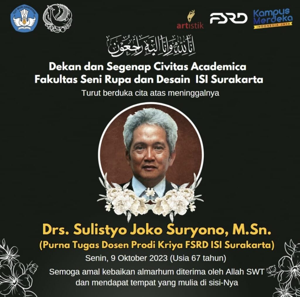 Dekan dan Segenap Civitas Academica Fakultas Seni Rupa dan Desain ISI Surakarta Turut berduka cita atas meninggalnya sahabat dan kolega, Drs. Sulistyo Joko Suryono, M.Sn. (Purna Tugas Dosen Prodi Kriya FSRD ISI Surakarta) pada hari Senin, 9 Oktober 2023 (Usia 67 tahun).