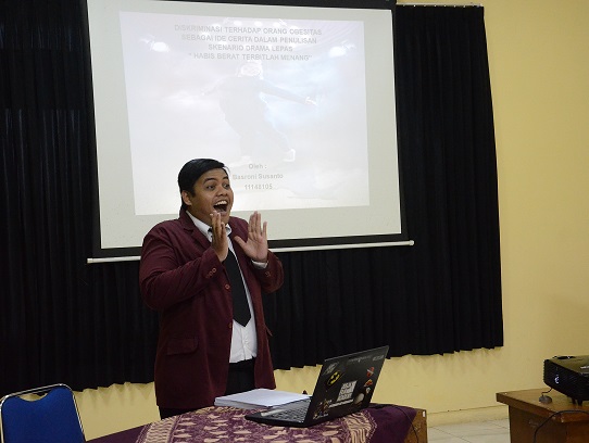Ujian Tugas Akhir Basroni Susanto telah dilaksanakan pada 12 Pebruari 2016 pukul 09.00 WIB di gedung dekanat lantai III. Basroni Susanto membuat karya skenario Habis Berat Terbitlah Menang. Dalam skenario ini diceritakan bahwa Yeni adalah seorang remaja yang memiliki obesitas yang memiliki mimpi untuk menjadi sineman peran. Oleh karena itu, Yeni memutuskan untuk untuk melanjutkan sekolah seni di Kota Solo.