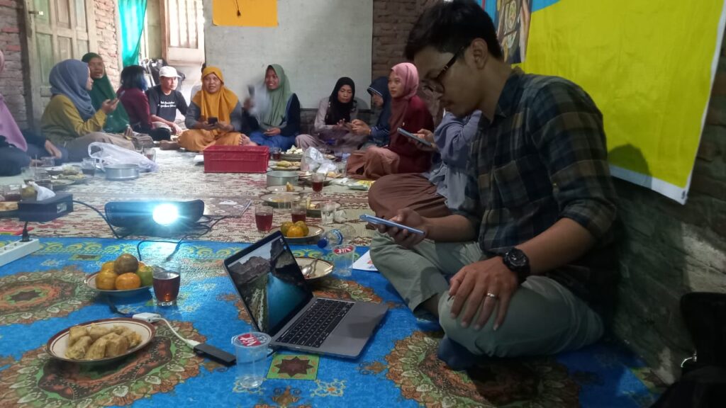 Beberapa warga peserta pendampingan dan pelatihan tampak antusias mengoperasikan handphone untuk membuat akun Instagram dalam kegiatan pengabdian kepada masyarakat ini.
